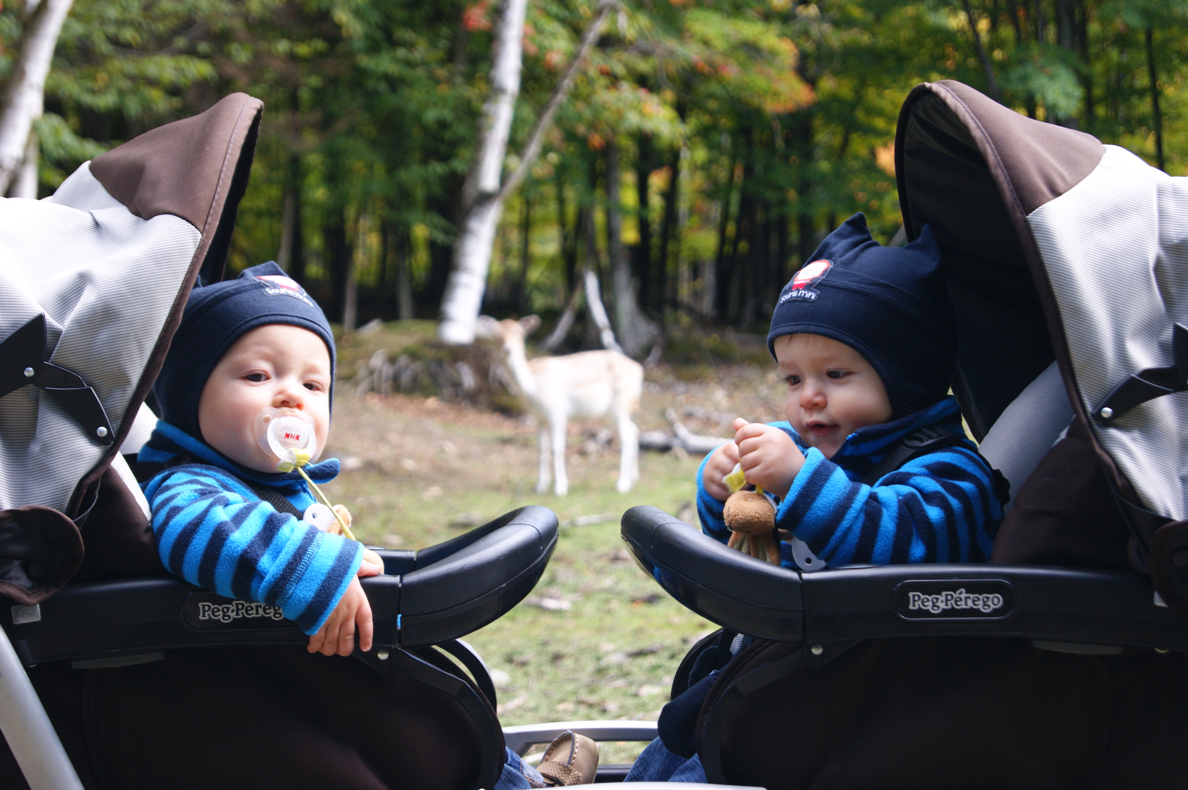 J’ai commencé à sortir de la maison sur une base régulière, mes jumeaux n’avaient pas 1 mois et je crois sincèrement, que les habituer à être dans la voiture, à se faire trimballer et à faire leur sieste dans plein d’endroits différents rend les sorties de plus en plus faciles. On les emmenait au restaurant, au magasin, on allait visiter de la famille à plus de 2 heures de route de la maison, on est allés au zoo… Même qu’à 9 mois, on les emmenait au Rodéo du festival de St-Tite qui s’est terminé à 22hrs, sans un cri ! Aujourd’hui, ils ont 13 mois et on les emmène encore partout avec nous, ils ont l’habitude et je pense que ça les a également rendus plus sociables puisqu’ils ont toujours des belles façons avec les étrangers qui viennent leur donner leurs microbes en leur touchant les mains et le visage…