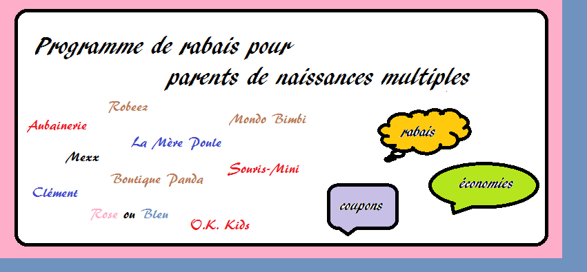 À partir du moment où j’ai apprise que nous aurions des jumeaux, je me suis mise à rechercher les rabais, les vrais; les « big deals ». Dès mon premier rendez-vous chez le médecin, on m’a avisé que certaines boutiques offraient des rabais aux parents de jumeaux. Je me suis donc mise à faire des recherches à ce sujet. Plusieurs sites parlent de rabais offerts, de coupons envoyés, etc… Les principaux rabais se retrouvent sur le site de Bébés au pluriel (http://www.bebesaupluriel.com/index.php?option=com_content&task=view&id=26&Itemid=48). Le problème c’est qu’une fois qu’on tente de s’en prévaloir, on se bute constamment à des politiques internes qui nous les refusent ou qui « changent » les données.