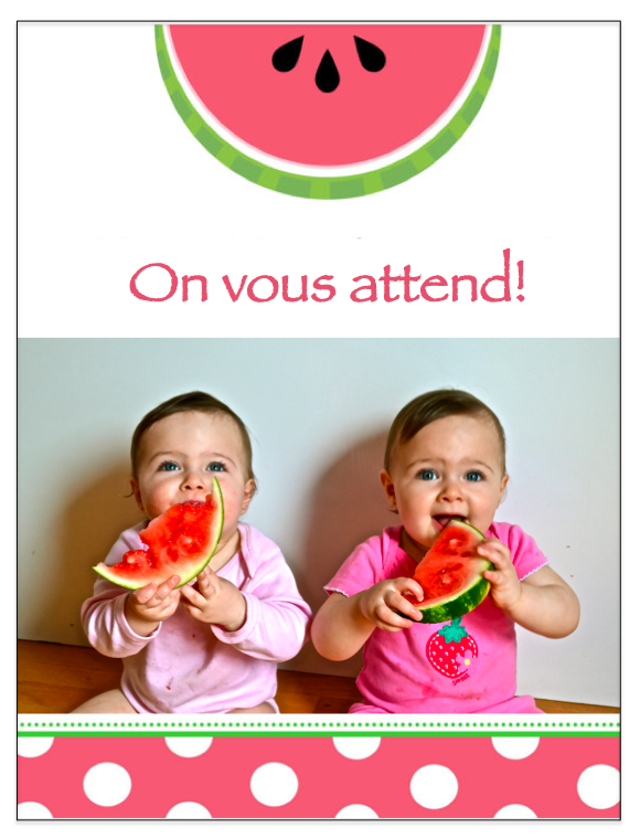 Personnellement, j’ai opté pour l’option de créer moi-même mon invitation sur Powerpoint puisque je maîtrise très bien ce programme et ne voulais pas dépenser pour les invitations. Je tenais à mettre une photo de mes filles, j’ai donc fait un mini photo-shoot la journée de l’envoi de l’invitation. Mon thème étant le melon d’eau, j’ai donné 2 gros morceaux de melon à mes filles (qui par hasard étaient habillées de rose ce jour-là) et j’ai pris quelques photos pour finalement en choisir une que j’ai mis sur l’invitation. J’ai fait une page couverture avec photo et texte court du genre “on vous attend” et une page avec l’information de la fête: nom des fêtés, date, heure, adresse et confirmation de votre présence. Temps total de préparation 30 minutes et beaucoup de plaisir à prendre les photos avec mes filles collées de melon! J’ai envoyé l’invitation par email et reçu des commentaires très positifs!
