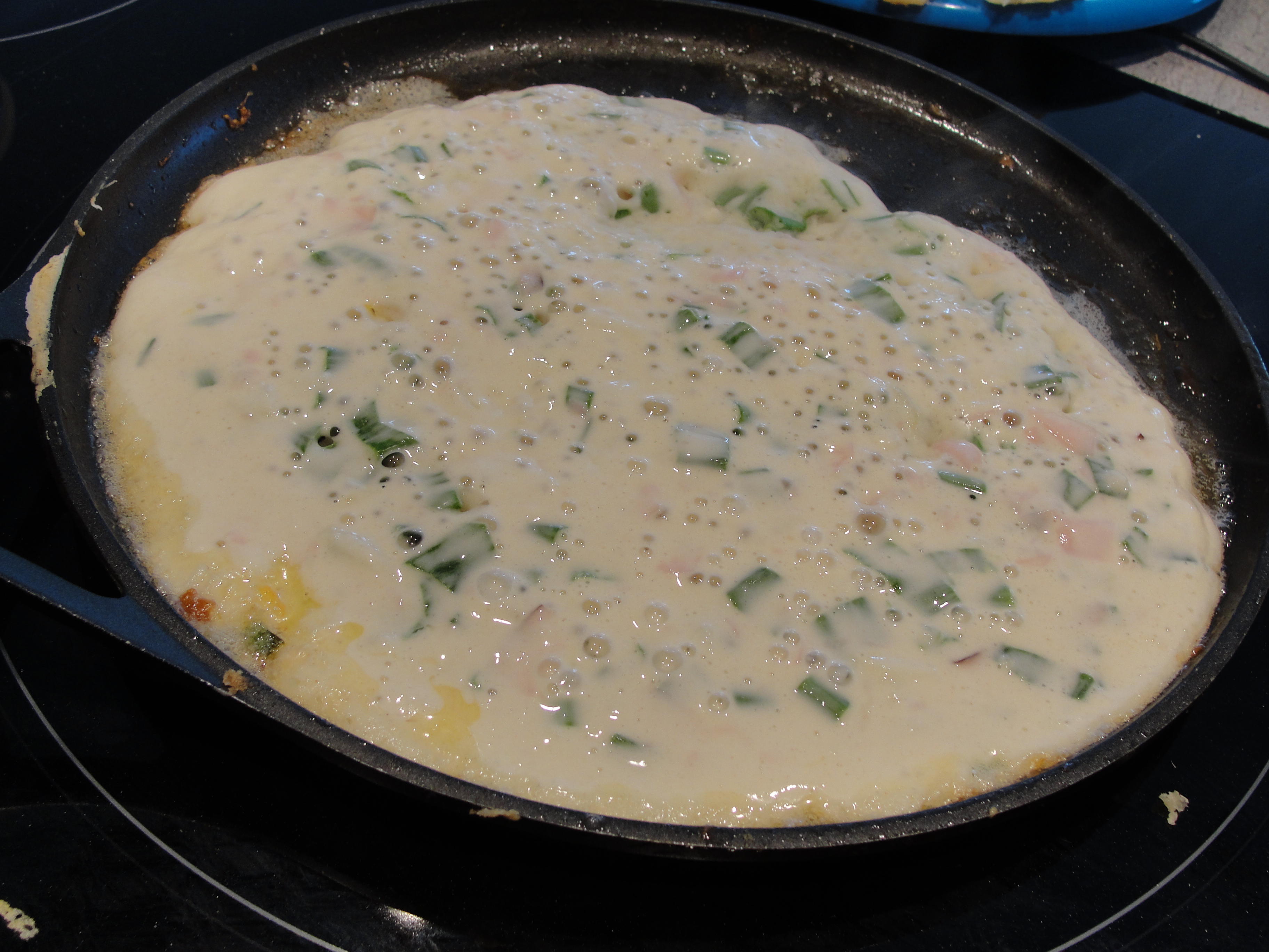Préparer le mélange à crêpe et y ajouter les échalotes coupées finement, une pomme épluchée et râpée; plus ou moins une demi-tasse de jambon forêt noir (nous prenons le Tour Eiffel) déchiqueté finement. Mélanger le tout au malaxeur.