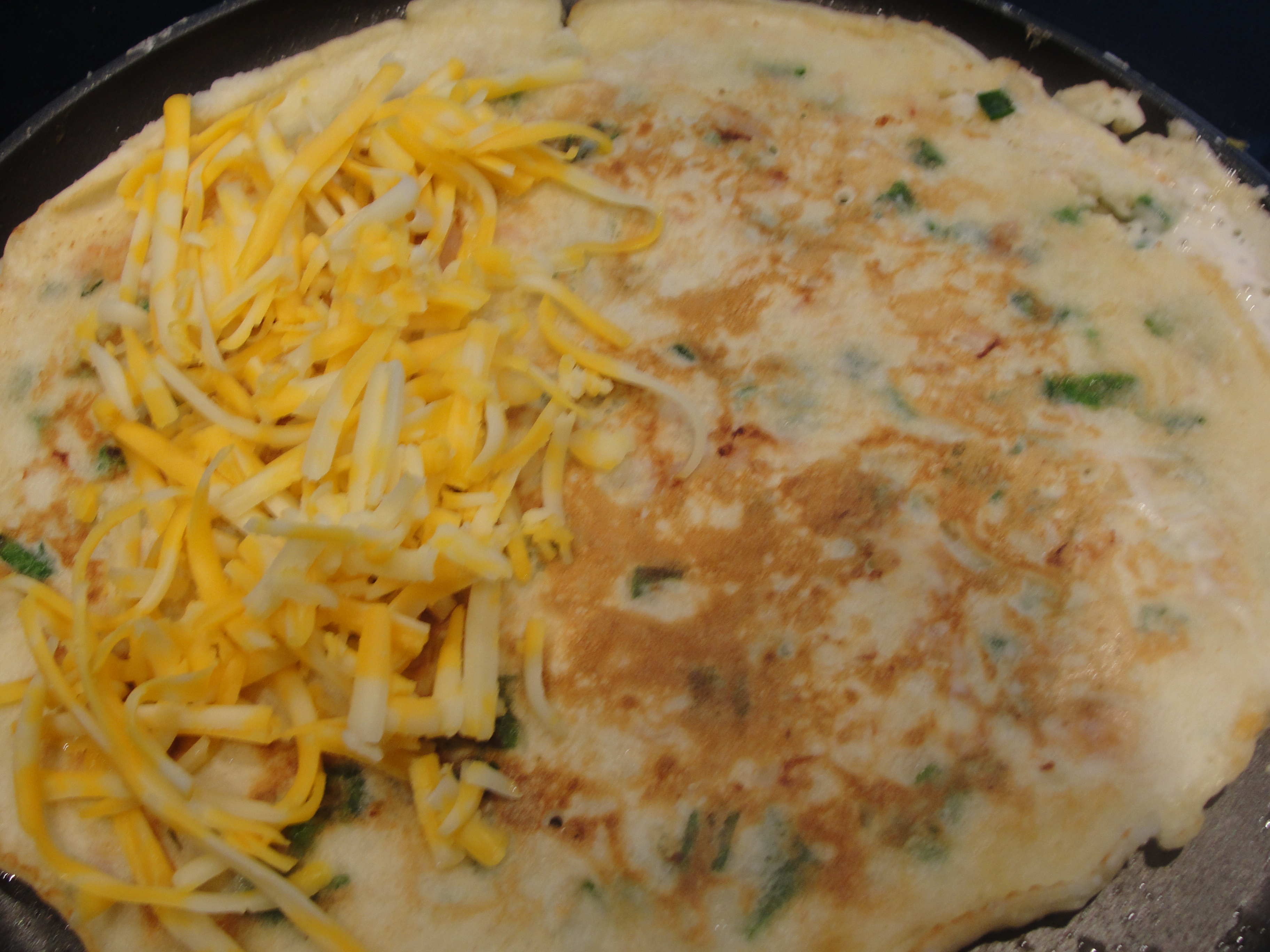 Une fois la crêpe prête à être retournée, la retourner et ajouter du cheddar râpé sur la moitié de la crêpe et refermer celle-ci sur elle-même. La virée à nouveau afin de bien dorer les deux côtés.