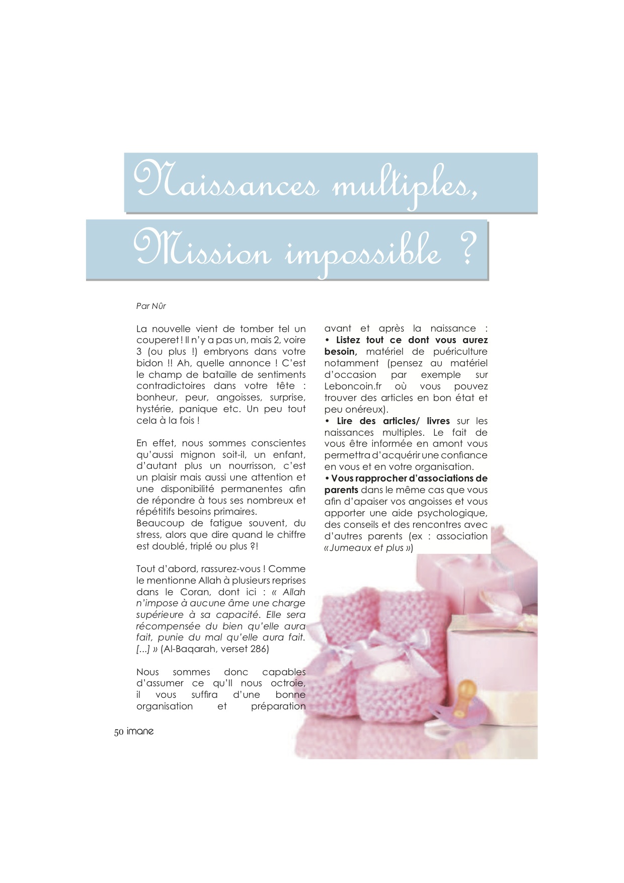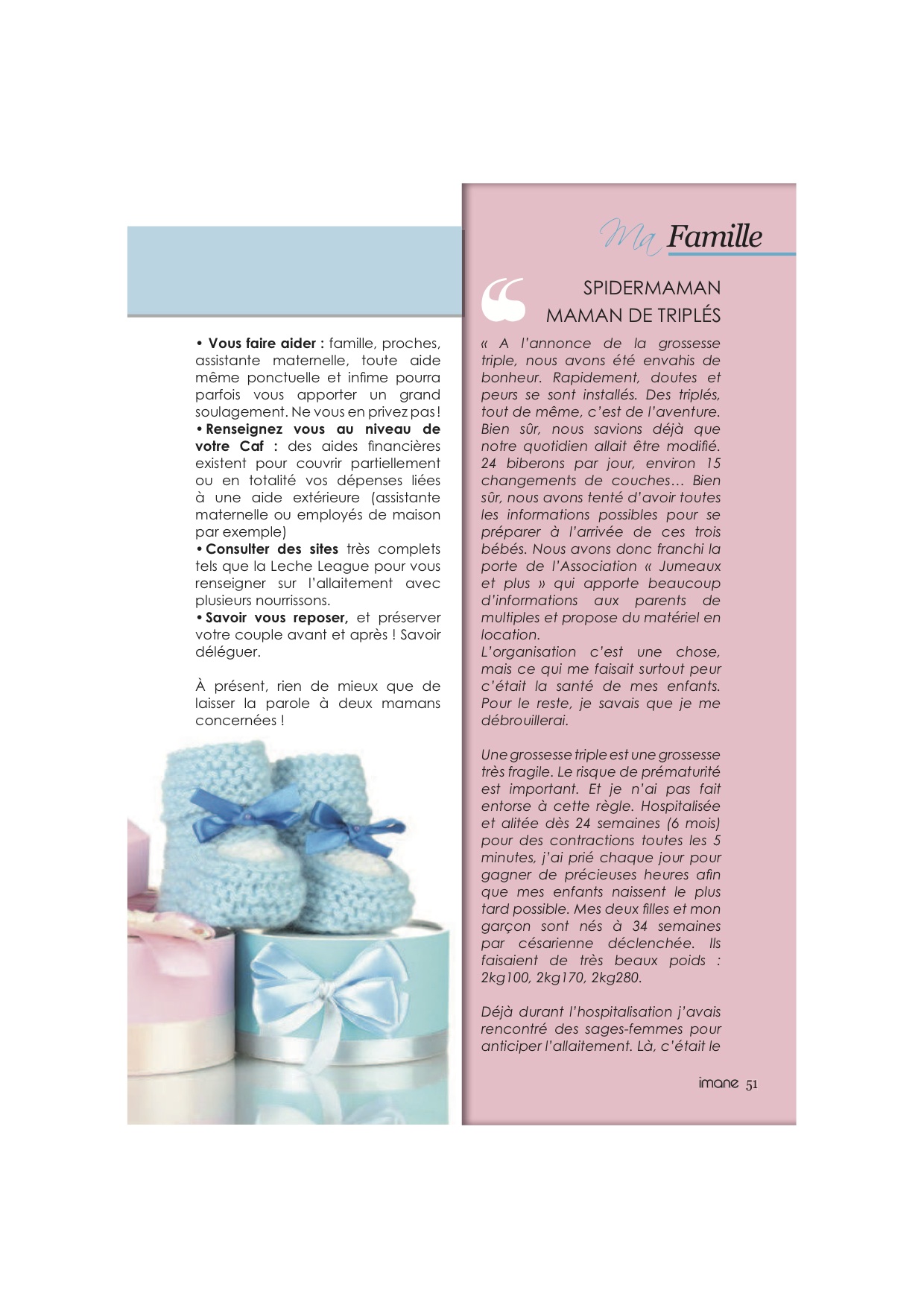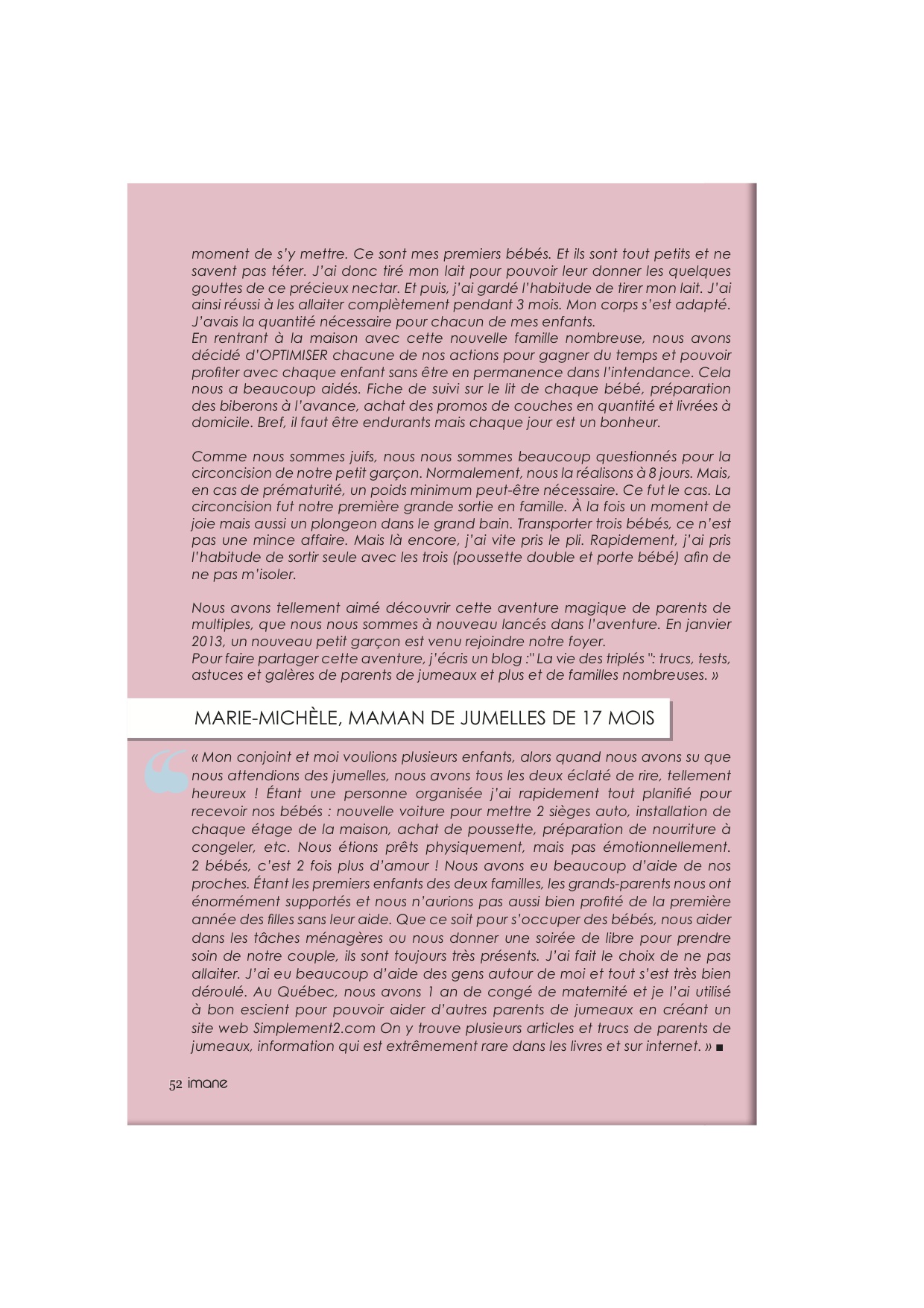 Cachotière que je suis, je ne vous ai pas confié, chers lecteurs (et même chers confrère-consoeurs blogueurs), que j’ai été approchée il y a quelques semaines pour participer à un article sur les naissances multiples dans le numéro de janvier-février du magazine Imane, un magazine destiné aux femmes musulmanes.
