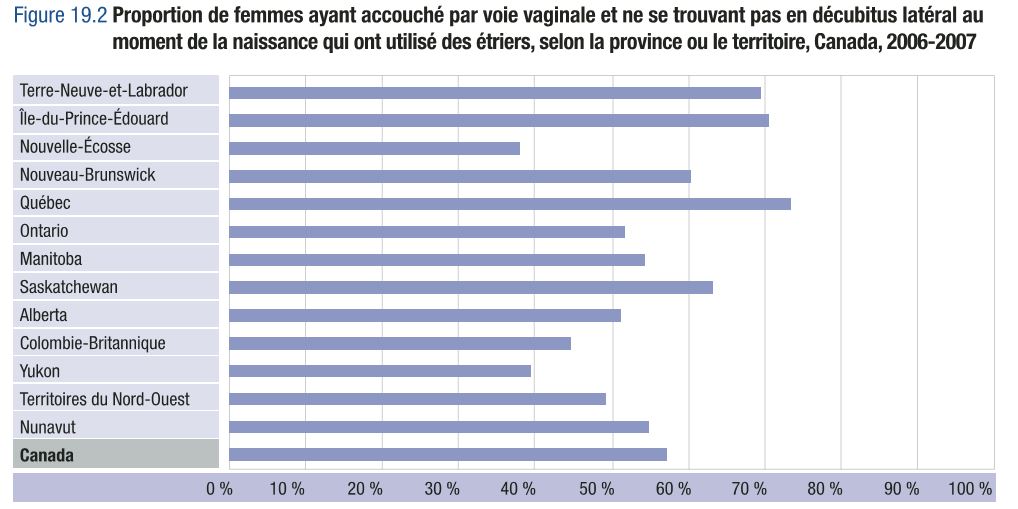 Choisir sa position pour accoucher est un droit et d’autres provinces au Canada ont commencé à le comprendre… Selon la dernière enquête canadienne sur l’expérience de la maternité, au Yukon, par exemple, on note le taux le plus faible d’utilisation du décubitus dorsal avec un peu plus de 20%, suivi de l’Île-du-Prince-Édouard avec plus ou moins 25% et les Territoires du Nord-Ouest avec plus ou moins 35%. L’Ontario et le Québec font piètre figure avec leur 50% et 60% respectifs!